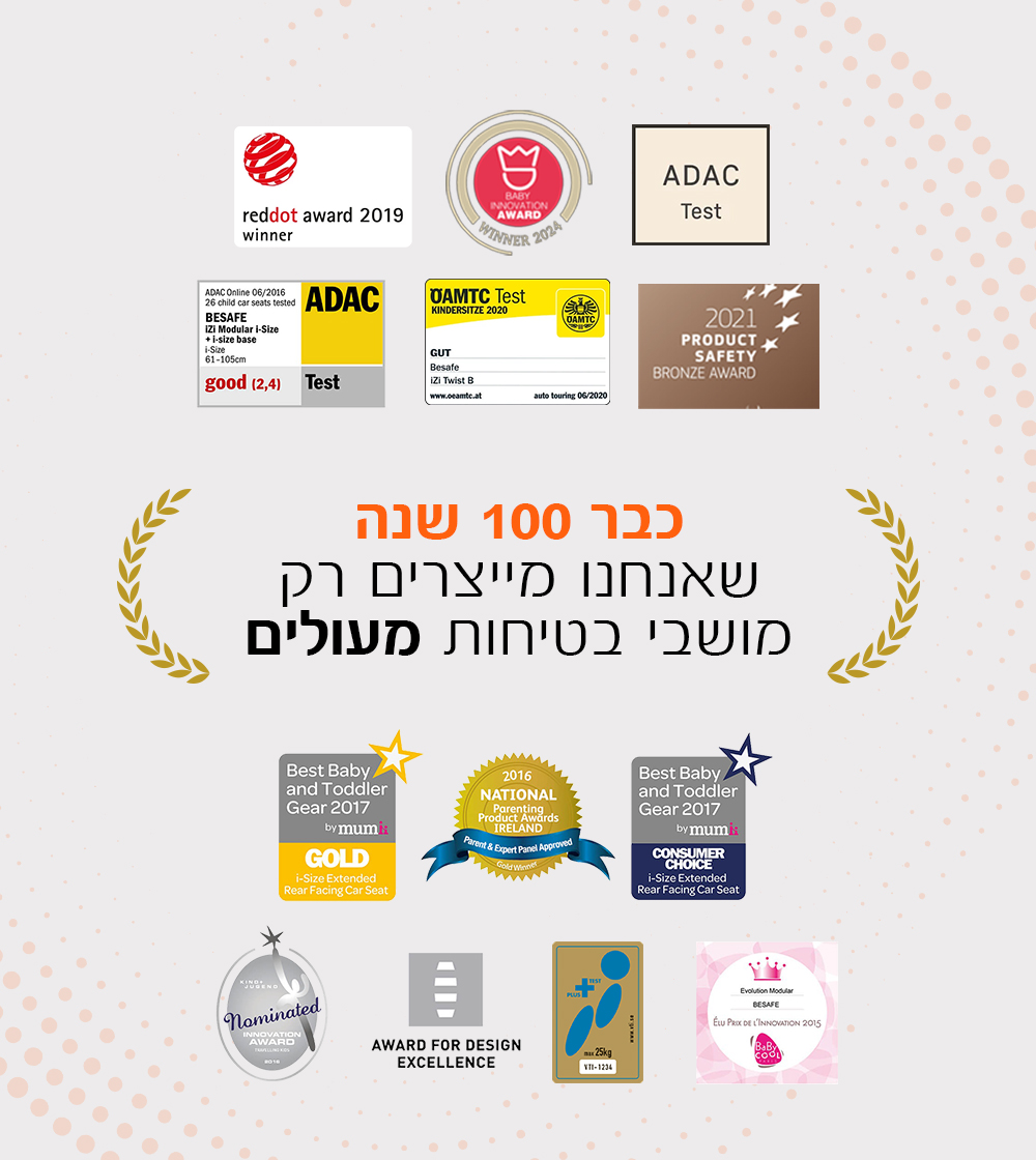חברת BeSafe מפתחת מושבי בטיחות לרכב כבר יותר מ-50 שנה. הרבה השתנה עם הזמן, אבל המיקוד שלנו תמיד נשאר ברור: בטיחות הילד מעל הכל!. בעניין זה, לעולם לא ננוח על זרי דפנה ותמיד נשאף להתאים את עצמנו לדרישות הבטיחות המחמירים והמעודכנים ביותר. אנו, ב-BeSafe, עסוקים כל העת בפיתוח חידושים מתקדמים כדי להפוך את המוצרים שלנו לבטוחים וידידותיים עוד יותר.